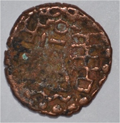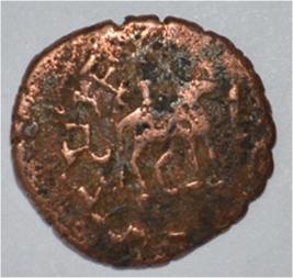 Coin in irregular shape. Obverse Deer at the centre and facing left. Brahmi legend in semi-circle. Reverse Swastika on the top right, arched hill with umbrella at the centre, tree in railing in left and nandi pada on the top.