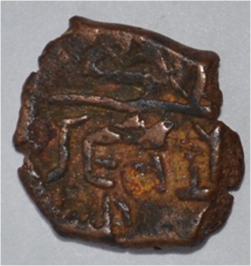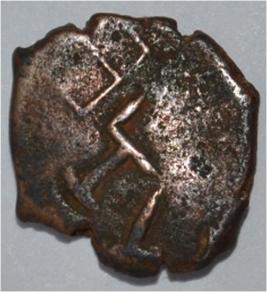 Coin in irregular shape. Obverse Brahmi legend at the centre. Reverse Arched hill on the top and traces of legend at the centre.