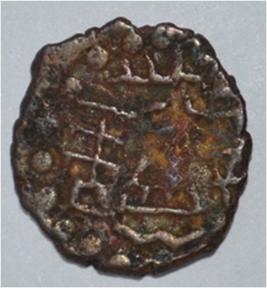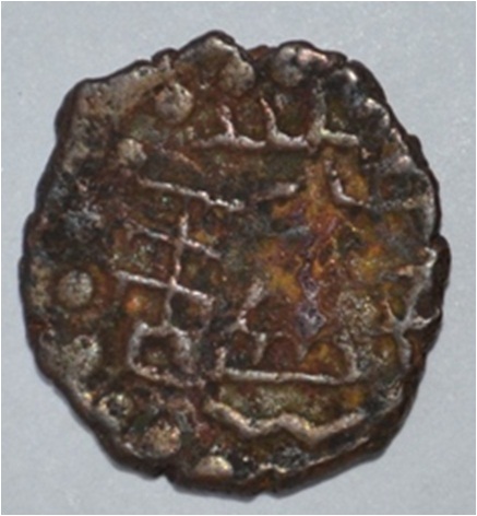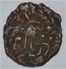 Coin in irregular shape. Obverse Deer at the centre and facing female figure with upraised right hand and left hand on the hip. Brahmi legend on the top. Reverse Tree in railing on the right, arched hill at the centre, triangle headed on the left, swastika above and nandi pada on the top.