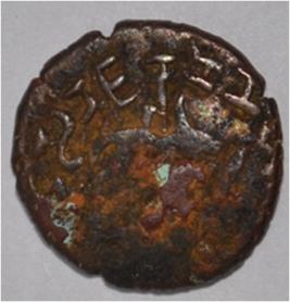 Coin in irregular shape. Obverse Deer at the centre and facing left. Brahmi legend on the top. Reverse Tree in railing on the right, six arched hill with umbrella at the centre, triangle headed on the left and swastika above.