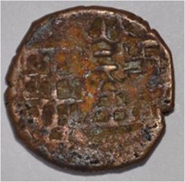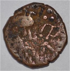 Coin in irregular shape. Obverse Deer on the top right and facing female figure with up raised right hand. Brahmi legend below. Reverse Tree in railing on the right, six arched hill with umbrella at the centre, triangle headed on the left and swastika above and nandi pada on the top.