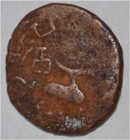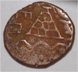 Coin in irregular shape. Obverse Deer at the bottom and facing left. Brahmi legend in right top. Reverse Tree in railing on the right, ten arched hill at the centre and wavy line below it.