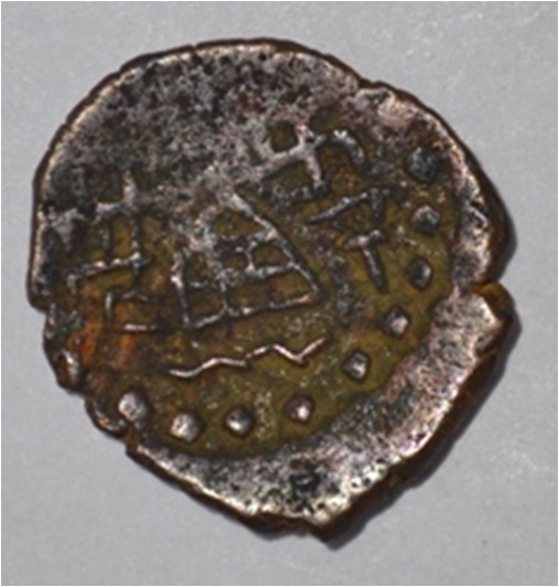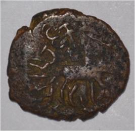 Coin in irregular shape. Obverse Deer at the bottom and facing left. Brahmi legend in semi-circle. Reverse Tree in railing on the right, seven arched hill at the centre, triangle headed on the left and swastika above.