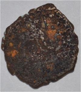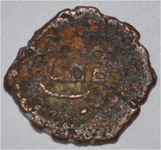 Coin in irregular shape. Obverse Deer on the top and facing female figure with upraised right hand. Brahmi legend in semi-circle. Reverse Triangle headed on the right, arched hill with umbrella at the centre and tree in railing in left and nandi pada on the top.