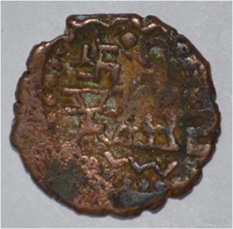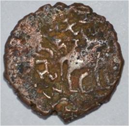 Coin in irregular shape. Obverse Deer on the left and brahmi legend in semi-circle. Reverse Triangle headed on the right and swastika above, arched hill with umbrella at the centre and tree in railing in left.