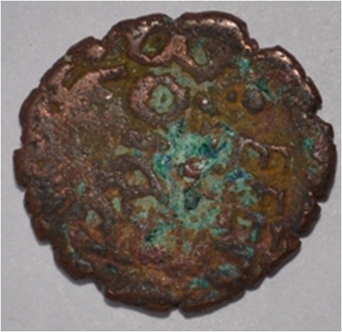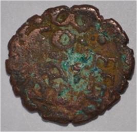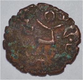 Coin in irregular shape. Obverse Deer at the centre and facing female figure. Brahmi legend in semi-circle. Reverse Arched hill with umbrella at the centre, tree in railing in left and nandi pada on the top.
