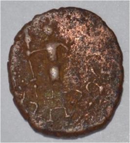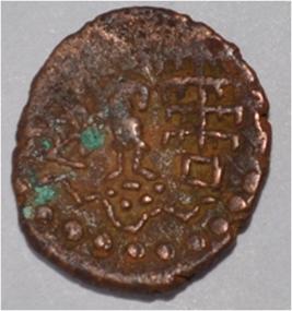 Coin in irregular shape. Obverse Male Kartikeya standing and facing. Sakti in right hand and left hand on the hip. Brahmi legend in semi-circle. Reverse Female Shashthi standing facing,right hand upraised and left hand on hip, tree in railing in left.