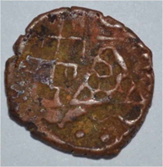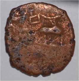 Coin in irregular shape. Obverse Deer on the top left and facing. Lower portion is eroded. Reverse Tree in railing in right , ten arched hill with umbrella on the left and wavy lline below. Dotted border on the left.