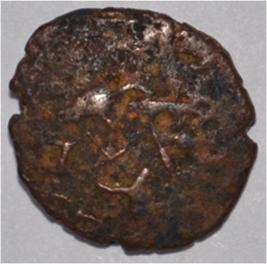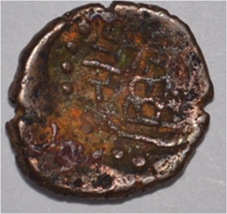 Coin in irregular shape. Obverse Deer at the bottom, arched hill in left and an unidentified figure above. Traces of legend in semi-circle. Reverse Triangle headed on the right, swastika above and six arched hill with umbrella on the left. Dotted border in semi-circle.