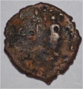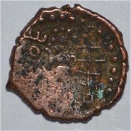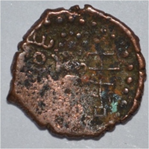 Coin in irregular shape. Obverse Four headed male Kartikeya standing and facing in left. Sakti in right hand and left hand on the hip. Traces of legend in right. Reverse Nindi pada on the top right, six headed female Shashthi standing and facing, with upraised right hand and left on hip, tree in railing in left.