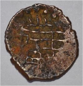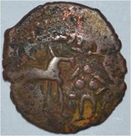 Coin in irregular shape. Obverse Deer on the right and facing female figure with upraised right hand and left hand on hip. Traces of legend above. Reverse Swastika on the right , five arched hill with umbrella at the centre, tree in railing in left and nandi pada on the top.