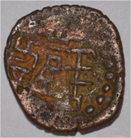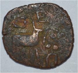 Obverse Deer at the centre and facing female figure with upraised right hand. Brahmi legend on the top. Reverse Triangle headed on the right and swastika above, six arched hill with umbrella at the centre, tree in railing in left and nandi pada on the top.
