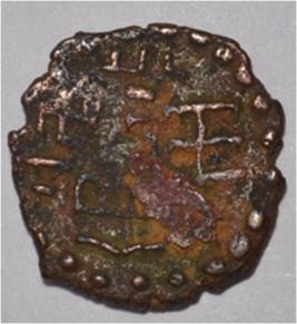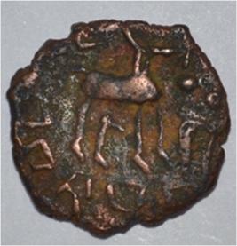 Coin in irregular shape. Obverse Deer on the top and facing female figure. Brahmi legend in semi-circle. Reverse Triangle headed on the right and swastika above , six arched hill with umbrella at the centre, tree i n railing in left and nandi pada on the top.