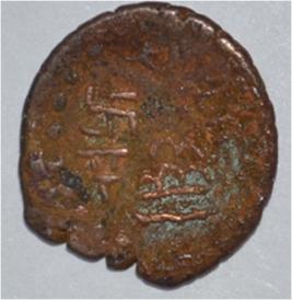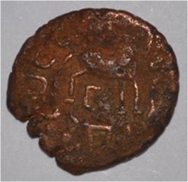 Coin in irregular shape. Obverse Deer at the centre and facing female figure. Brahmi legend in semi-circle. Reverse Triangle headed on the right and swastika above , arched hill with umbrella at the centre and nandi pada on the top.