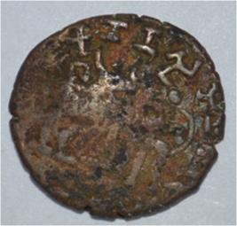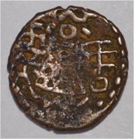 Coin in irregular shape. Obverse Deer at the centre and facing female figure with left hand on the hip. Brahmi legend at the top left. Reverse Triangle headed with base on the right and swastika above, arched hill with umbrella at the centre, tree in railing in left and nandi pada on the top.