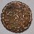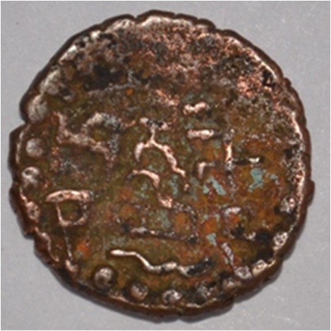 Coin in irregular shape. Obverse Deer on the top and facing female figure with upraised right hand and left hand on hip. Brahmi legend in semi-circle. Reverse Triangle headed on the right and swastika above, arched hill with umbrella at the centre and tree in railing in left.
