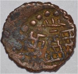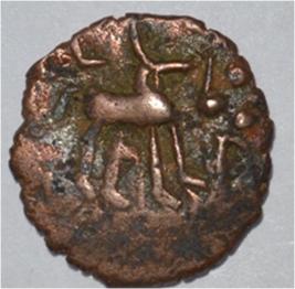 Coin in irregular shape. Obverse Deer at the centre and facing female figure with upraised right hand. Brahmi legend on the top. Reverse Triangle headed at the lower right and swastika above , six arched hill with umbrella at the centre, tree in railing in left and nandi pada on the top.