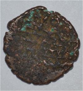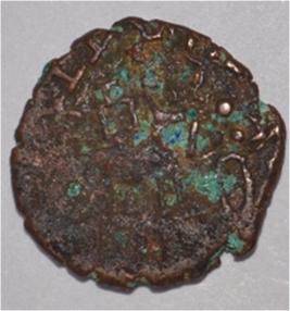 Coin in irregular shape. Obverse Deer at the centre and facing female figure with upraised right hand and left hand on hip. Traces of legend on the top. Reverse Triangle headed on the lower right and swastika above, arched hill with umbrella at the centre and branches of tree in left.