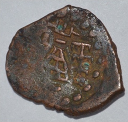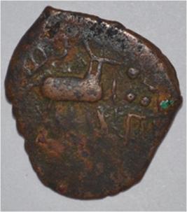 Coin in irregular shape. Obverse Deer at the centre and facing female figure with upraised right hand. Brahmi legend above deer. Reverse Arched hill with umbrella at the centre, tree in railing in left and nandi pada on the top.