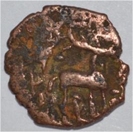 Coin in irregular shape. Obverse Deer at the bottom and facing left Traces of legend in semi-circle. Reverse Triangle headed on the right and swastika above , arched hill with umbrella at the centre, tree in railing in left and nandi pada on the top.