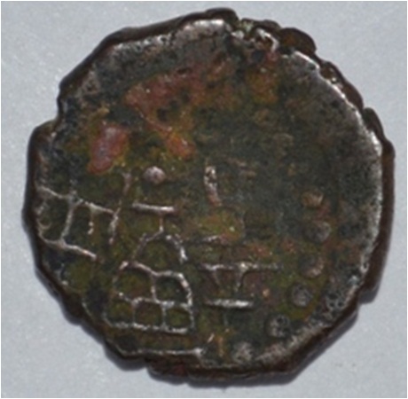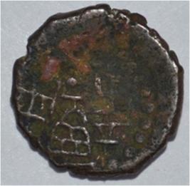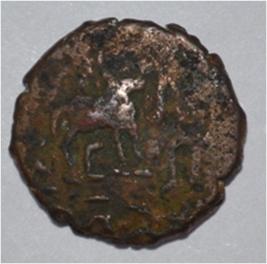 Coin in irregular shape. Obverse Deer on the top and facing female figure. Brahmi legend at lower right. Reverse Tree in railing in right, six arched hill with umbrella at the centre, triangle headed on the right and swastika above.
