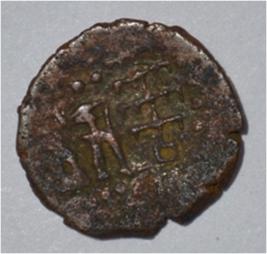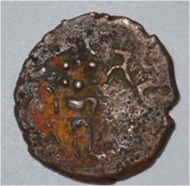 Coin in irregular shape. Obverse Six headed male Kartikeya standing and faicng with upraised right hand and left on hip. Traces of legend in left. Reverse Arched hill on the right, female Shashthi standing facing, right hand upraised, left hand on hip at the centre and tree in railing on the left.