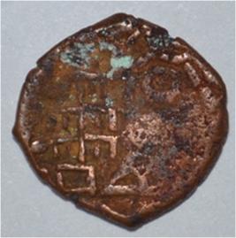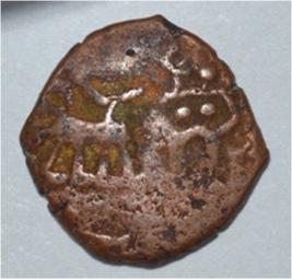 Coin in irregular shape. Obverse Deer at the centre and facing female figure with upraised right hand and left hand on hip. Reverse Tree in railing on the right, arched hill at the centre and nandi pada on the top.
