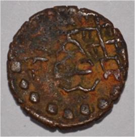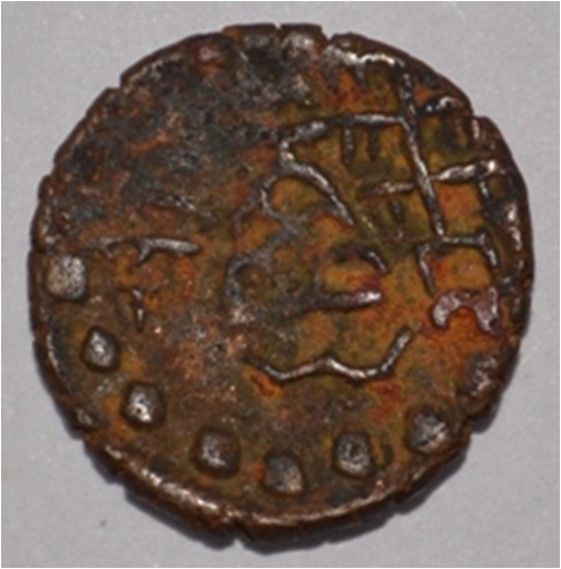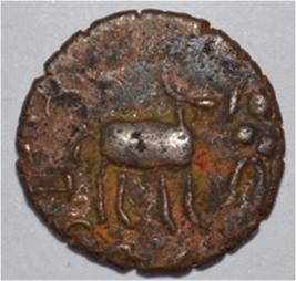 Coin in irregular shape. Obverse Deer at the centre and facing female figure with upraised right hand. Brahmi legend in semi-circle. Reverse Triangle headed on the right, six arched hill with umbrella at the centre and tree in railing in left.