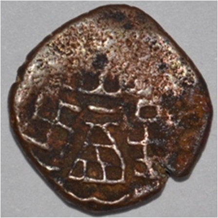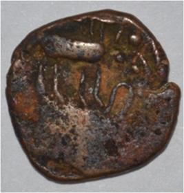 Coin in irregular shape. Obverse Deer on the top and facing female figure with upraised right hand. Reverse Swastika in right , six arched hill with umbrella at the centre, tree in railing in left and nandi pada on the top.