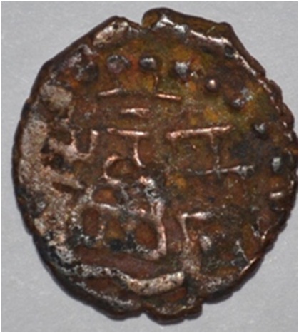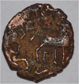 Coin in irregular shape. Obverse Deer on the left and brahmi legend in semi-circle. Reverse Swastika in right, six arched hill with umbrella at the centre, tree in railing in left and nandi pada on the top.