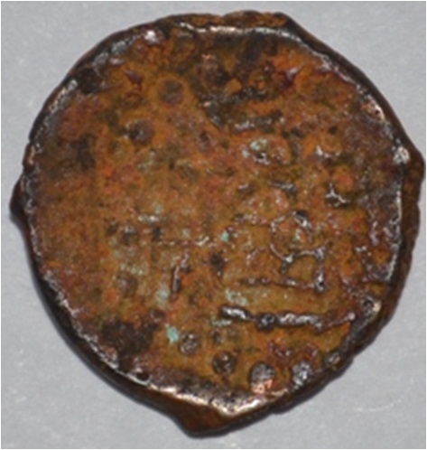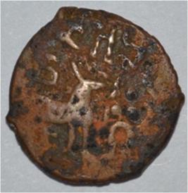Coin in irregular shape. Obverse Deer at the centre and facing female figure with upraised right hand and left hand on hip. Brahmi legend on the top. Reverse Swastika in right ,arched hill with umbrella at the centre, tree branches in left and nandi pada on the top.