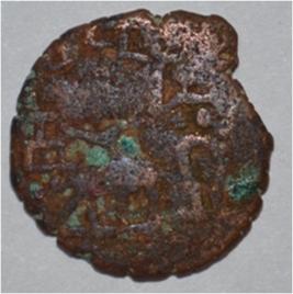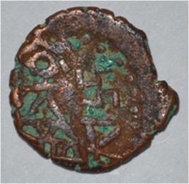 Coin in irregular shape. Obverse Deer at the centre and facing female figure with upraised right hand. Brahmi legend on the top. Reverse Arched hill with umbrella on the right, nandi pada above, triangle headed on left and swastika above.