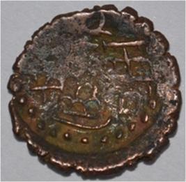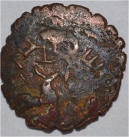 Coin in irregular shape. Obverse Deer at the bottom and facing left and brahmi legend above. Reverse Triangle headed in right ,arched hill with umbrella at the centre,swastika above, tree in railing in left and nandi pada on the top.
