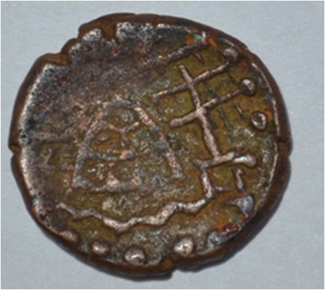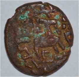 Coin in irregular shape. Obverse Deer at the center and facing female figure with upraised right hand. Brahmi legend top and bottom. Reverse Triangle headed on the right and swastika above , six arched hill with umbrella at the centre, tree in railing in left and nandi pada on the top.