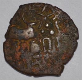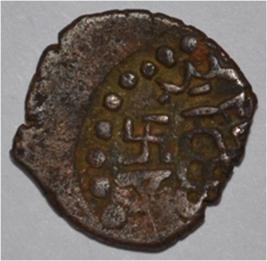 Coin in irregular shape. Obverse Deer on the top right and facing female figure with upraised right hand. Brahmi legend top and bottom. Reverse Triangle headed on the right and swastika above , arched hill at the centre, tree branches in left and nandi pada on the top.