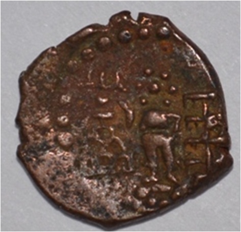 Coin in irregular shape. Obverse Male Kartikeya standing and traces of legend in left. Reverse Arched hill in left, nandi pada above, seven headed female figure with upraised right hand and left hand on hip at the centre, tree in railing in left.