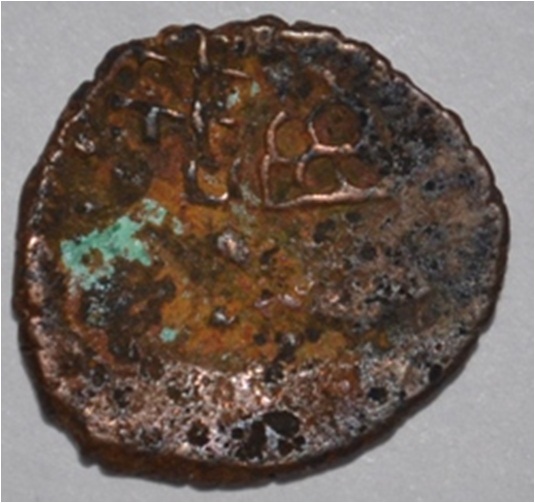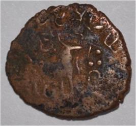 Coin in irregular shape. Obverse Deer at the centre and facing female figure with upraised right hand. Brahmi legend in semi-circle. Reverse Triangle headed on the top right tree in railing in centre and arched hill on the top left.