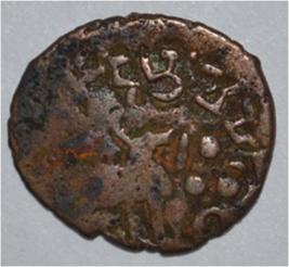 Coin in irregular shape. Obverse Deer at the centre and facing female figure with uprised right hand and left hand on hip. Brahmi legend on the top. Reverse Six arched hill at the centre, triangle headed on the left, swastika above and nandi pada on the top.