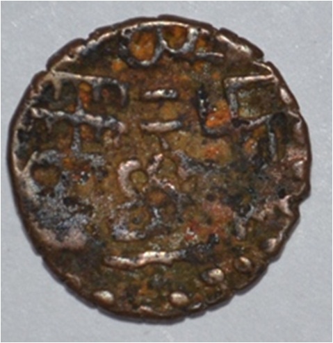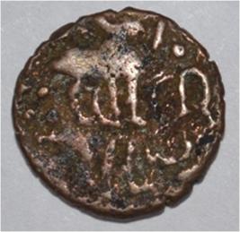 Coin in irregular shape. Obverse Deer on the top and facing female figure with upraised right hand. Reverse Tree in railing in right , arched hill with umbrella at the centre, swastika on the left and nandi pada on the top. Dotted border at the bottom and wavy line below the arched hill.