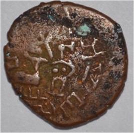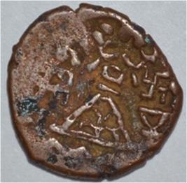 Coin in irregular shape. Obverse Deer on the right and facing female with upraised right hand and left hand on the hip. Brahmi legend in left top to bottom. Reverse Tree in railing in right, six arched hill with umbrella at the centre wavy line below, triangle headed on the right, swastika above and nandi pada on the top.
