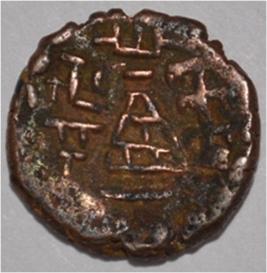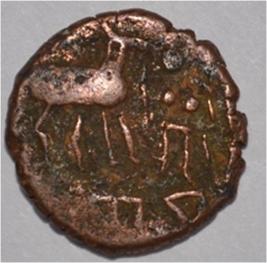 Coin in irregular shape. Obverse Deer on the top and facing female figure. Brahmi legend at the bottom. Reverse Triangle headed on the right and swastika above, six arched hill with umbrella at the centre, tree in railing in left and nandi pada on the top.