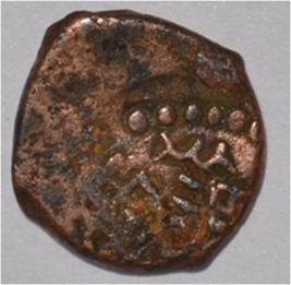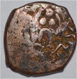 Coin in irregular shape. Obverse Deer at the centre and facing female figure with upraised right hand. Brahmi legend in left. Reverse Swastika in right, arched hill with umbrella at the centre, tree railing in left and nandi pada on the top.