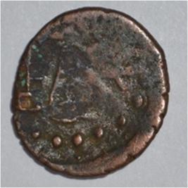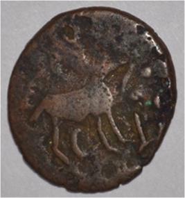 Coin in irregular shape. Obverse Deer at the centre and facing female figure with upraised right hand. Reverse Tree in railing on the right, arched hill at the centre, triangle headed in left and nandi pada on the top.