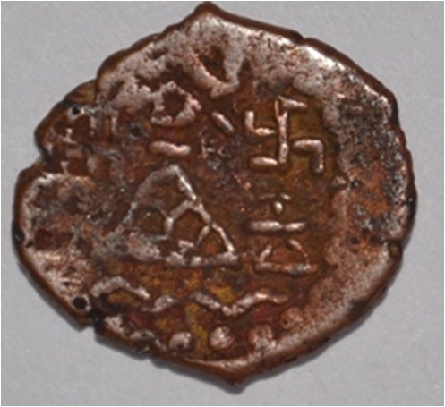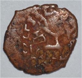 Coin in irregular shape. Obverse Deer at the centre and facing female figure with upraised right hand. Brahmi legend in semi-circle. Reverse Tree in railing on the right, six arched hill with umbrella at the centre, triangle headed with base on the left, swastika above and nandi pada on the top. Dotted border at the bottom and wavy line below arched hill.