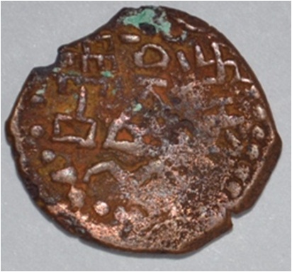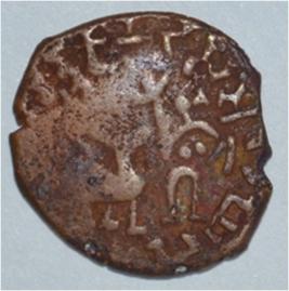 Coin in irregular shape. Obverse Deer at the centre and facing female figure with upraised right hand. Brahmi legend in semi-circle. Reverse Tree in railing in right, arched hill with umbrella at the centre, triangle headed on the left, swastika above and nandi pada on the top.