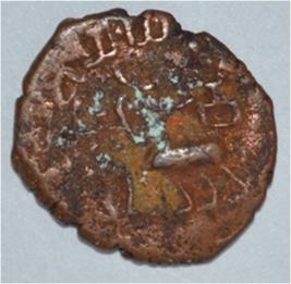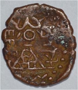 Coin in irregular shape. Obverse Deer on the left facing female to the right. Brahmi legend on the top. Reverse Tree branches in right, eight arched hill with umbrella at the centre, triangle headed with base on the left, swastika above and nandi pada on the top. Dotted border lower left and wavy line below arched hill.