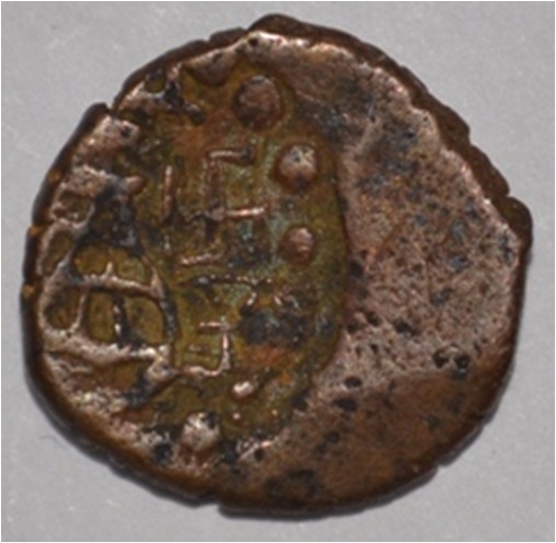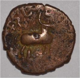 Coin in irregular shape. Obverse Deer at the centre and facing to left. Brahmi legend in top right. Reverse Six arched hill with umbrella on the right, triangle headed at the centre and swastika above.