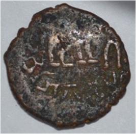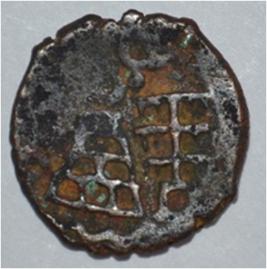 Coin in irregular shape. Obverse Deer on the top and facing female figure. Brahmi legend at the bottom. Reverse Arched hill with umbrella on the right, tree in railing in left and nandi pada on the top.