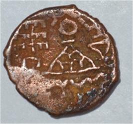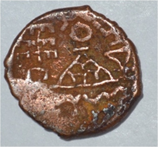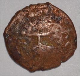 Coin in irregular shape. Obverse Deer at the centre and facing female figure in right. Brahmi legend in semi-circle. Reverse Tree in railing in right , seven arched hill with umbrella at the centre, triangle headed on the left , swastika above and nandi pada on the top.