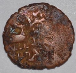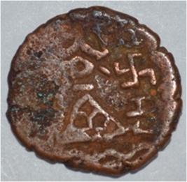 Coin in irregular shape. Obverse Deer on the right and facing female figure with upraised right hand. Traces of legend at the bottom. Reverse Six arched hill with umbrella at the centre, triangle headed on the left, swastika above and nandi pada on the top.